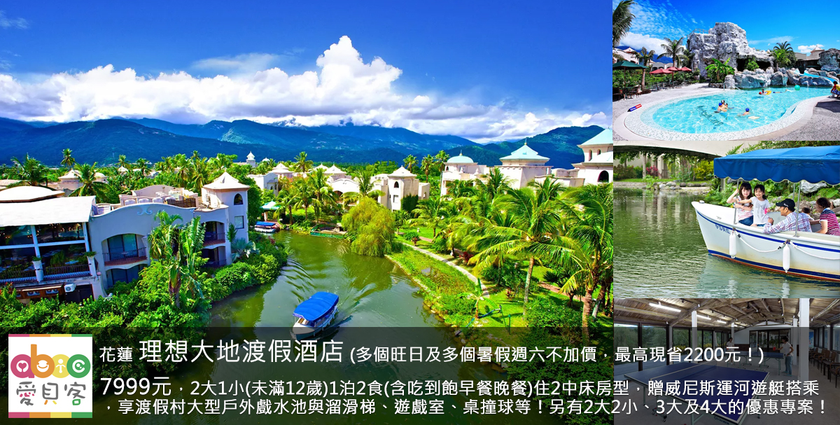 本專案享特定暑假週六(08/02、08/09、08/16、08/23不加價已額滿、08/30)限量不加價(現省1600元)+享多個9月週六假日(09/06、09/13、09/20、09/27)限量不加價(現省2200元)+多個旺日(7-8月週日到週五旺日、09/05、09/12、09/19、09/26)限量不加價(現省800元)+!2大1小(未滿12歲)1泊2食(含早晚餐)住二中床豪華客房平日只要7999元(2大1小訂房請點此),2大2小(未滿12歲)或3大1泊2食(含早晚餐)住二中床豪華客房平日只要9299元,4人(不限年紀)1泊2食(含早晚餐)住二中床豪華客房平日只要11499元!每日限量2間升等經典閣樓套房(二大床,訂房時可直接選該房型,現場不提供額外升等)!快帶小朋友來理想大地享受榮獲世界百大旅店的超美大型渡假酒店,除了可享威尼斯風光的美景運河搭乘每人一次外、還有萬坪綠地、戶外大型兒童戲水池、兒童遊戲室等10多項免費給小朋友的精彩休閒活動!另有三天二夜優惠專案(訂房請點此)!