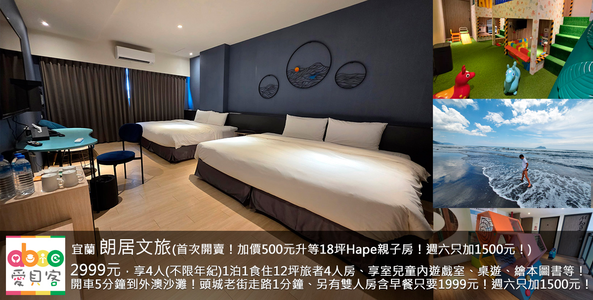 首次上架!宜蘭朗居文旅2999元享4人(不限年紀)1泊1食住4人房、2大1幼(未滿6歲)1泊1食住2人房只要1999元,方案享室內遊戲室、桌遊、繪本圖書、4人房限量加價500元升等18坪Hape親子房!2人房限量加價500元升等專屬車位的Mobi車庫房!開車5分鐘到外澳沙灘玩水!週六只加1500元!