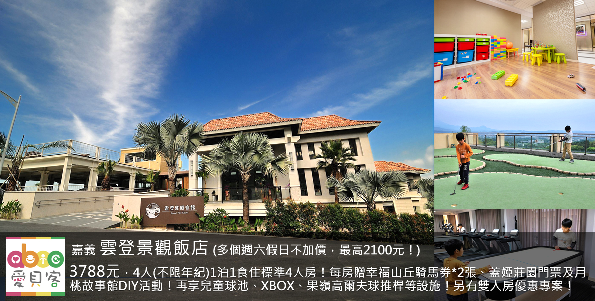超多週六假日不加價(11/01、11/15、12/06、12/13、12/20、12/27),最高現省2100元!這次愛貝客推出雲登景觀飯店,飯店就在阿里山下,緊鄰美麗漂亮的棕梠湖高爾夫球場旁,視野極佳,景致超美哦!這次推出4人(不限年紀)1泊1食平日住標準4人房只要3788元,平日享免費升等住雲登家庭套房(依現場安排為主),每房贈幸福山丘馬場騎馬券2張(價值400元)、贈蓋婭莊園門票4張(價值100元/張)及贈月桃故事館免費DIY活動(面膜、蔬果精、乾洗手3選1)!房間皆配置浴缸、再享飯店免費玩高爾夫球推桿練習場、兒童遊戲室、球池、手足球、XBOX遊戲等!加碼平日入住每房贈「三生三柿軟歐包」乙個(原價280元/個)!另有2大1小(未滿12歲)1泊1食入住雙人房只要3088元專案(請點此)!