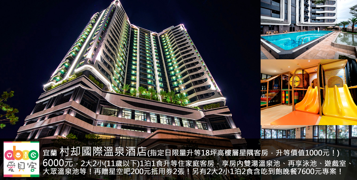指定日再享限量升等18坪高樓層星隅客房(升等價值1000元)!宜蘭-村却國際溫泉酒店優惠專案又來了!這次談到平日2大2小(11歲以下)1泊1食升等住家庭客房平日只要6000元,平日2大2小(11歲以下)1泊2食(吃到飽早晚餐)升等住家庭客房平日只要7600元的超優惠專案,每房再享房內專屬雙湯溫泉池、戶外泳池、兒童池、大眾SPA溫泉池、兒童遊戲室(溜滑梯、攀爬區、桌遊繪本)等設施!吃到飽早餐可享用到下午1點的早午餐!每房贈價值200元星空吧抵用券2張(低消400元)!