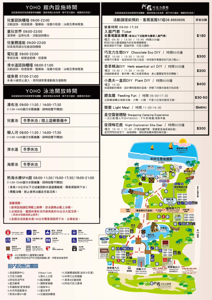 入住墾丁悠活渡假村YOHO景緻客房乙晚+依人數贈餐廳自然醒吃到飽的自助式早餐(可用餐至12:00)+平日(週日-週五)入住可免費升等巧克力兩中床或景緻樓中樓或是新兒童房(房型擇1,升等價值1000元)+本專案享星空夜秀買1送1+享加購阿信農場門票原價8折優惠(原價200元/張,請於悠活櫃台購買)+現場加購晚餐可享免10%服務費+懶人河+SPA水療區+餵魚的鯉魚池+童玩世界(兒童繪本閱讀區、探索小園地、大型積木溜滑梯)+迷你小巨蛋(攀爬架)+海岸玩沙戲水+免費網路+免費停車+付費接駁