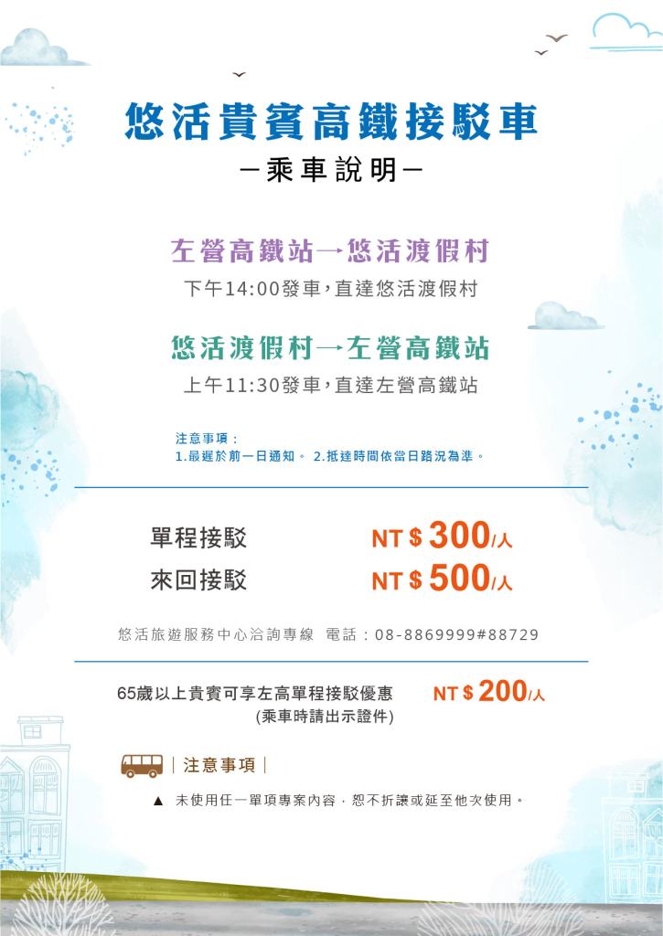 渡假村也有提供高鐵左營站至園區的付費接駁車服務,有需也可以與渡假村預約哦。