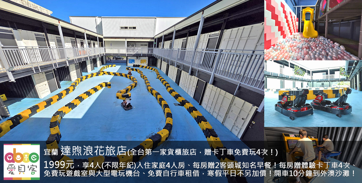 寒假平日不另加價!2025年全新開幕!體驗全台第一家貨櫃旅店!1999元享宜蘭-達煦浪花旅店4人(不限年紀)住貨櫃旅店4人房!每房贈2客頭城知名早餐!每房贈體驗卡丁車4次(每次3分鐘)、免費兒童遊戲室、免費大型電玩機台,開車10分鐘到外澳沙灘!