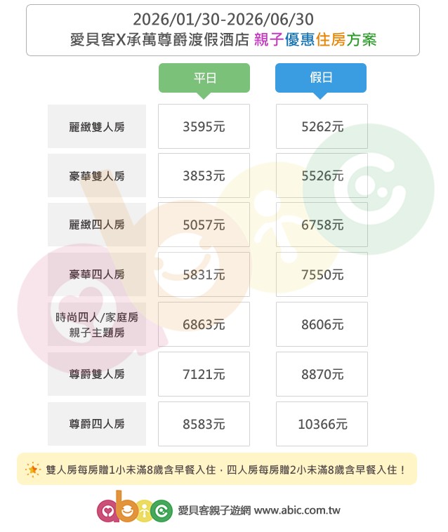 平日3595元起2大1泊1食住麗緻雙人房,5057元起享4人(不限年紀)1泊1食入住麗緻四人房的超優惠專案!再享雙人房每房贈1小未滿8歲含早餐入住,四人房每房贈2小未滿8歲含早餐入住!