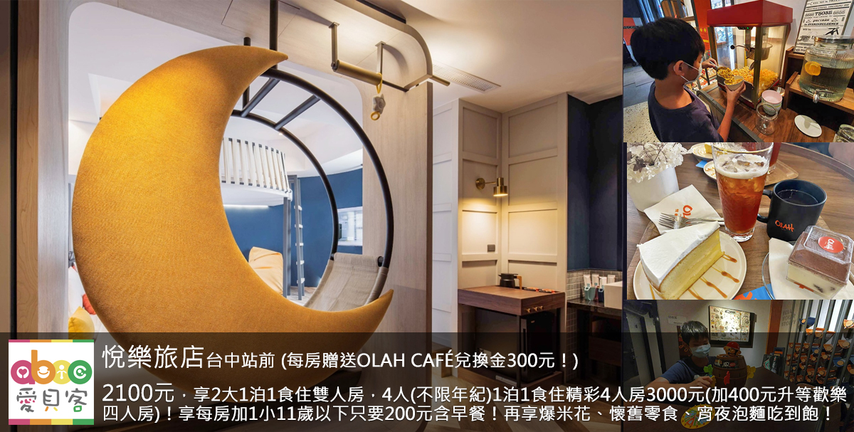 小假日(一般週五)享不加價!想來台中市玩的家庭看過來,愛貝客推出2022年開幕的台中市-悅樂旅店台中站前,是遠雄集團旗下的旅宿品牌,以輕奢華、年輕、新潮為主軸的旅店,本專案為2大1泊1食住陽光雙人房平日只要2100元,平日2大1泊1食住活力客房(一大床/二小床)只要2400元,4人(不限年紀)1泊1食住精彩4人房只要3000元,4人(不限年紀)1泊1食住歡樂4人房只要3400元!每房贈送OLAH CAFÉ兌換金300元(OLAH CAFE 兌換金限入住期間使用,不可延期亦不找零)。