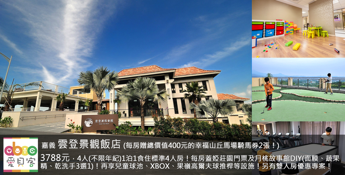 這次愛貝客推出雲登景觀飯店,飯店就在阿里山下,緊鄰美麗漂亮的棕梠湖高爾夫球場旁,視野極佳,景致超美哦!這次推出4人(不限年紀)1泊1食平日住標準4人房只要3788元,平日享免費升等住雲登家庭套房(升等房間數量有限,依現場安排為主),每房贈幸福山丘馬場騎馬券2張(價值400元)、贈蓋婭莊園門票4張(價值100元/張)及贈月桃故事館免費DIY活動(面膜、蔬果精、乾洗手3選1)!房間皆配置浴缸、再享飯店免費玩高爾夫球推桿練習場、兒童遊戲室、球池、手足球、XBOX遊戲等!另有2大1小(未滿12歲)1泊1食入住雙人房只要3088元專案(請點此)!