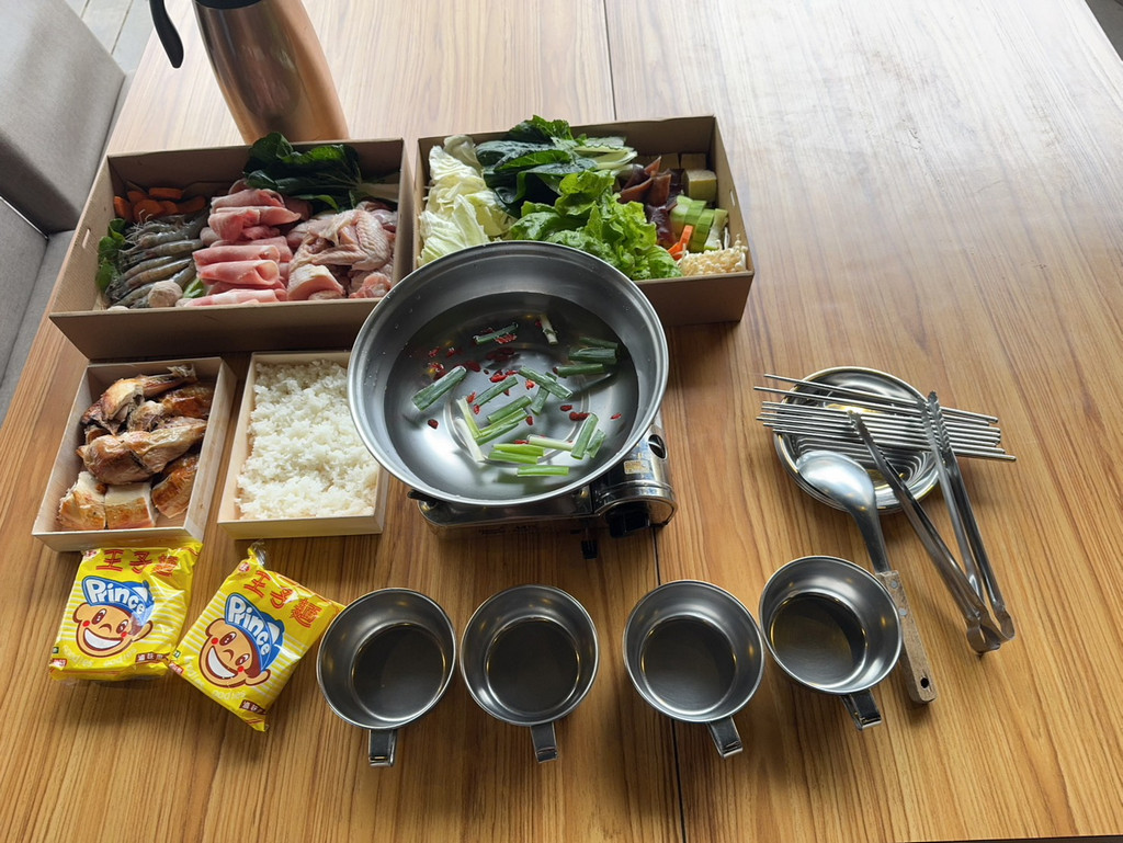 也可以選擇1泊2食專案, 晚餐食材內容說明《野炊山煮鍋》2-4人一份,生食: 土雞火鍋(半隻生土雞)肉片16片、蝦子8隻、菜盤: 火鍋蔬菜、主食:王子麵2份+白飯2份、熟食:烤雞一份(半隻)並提供器具:卡式爐一台、火鍋鍋子一個、湯匙一隻、四人份餐具(鐵盤+鐵碗+鐵筷)。(內容參考,依實際為主)