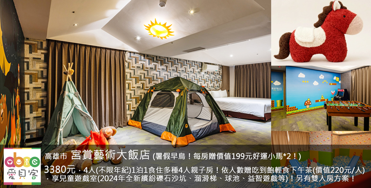 暑假早鳥!每房贈價值199元好運小馬娃娃2個(不可挑選隨機贈送),再享吃到飽輕食下午茶!超多特色親子房的宮賞藝術大飯店就位於高雄市區,除了原有的宮之野蠻遊室外,2024年6月推出全新繽紛礫石沙坑,另外還有益智遊戲、洞洞牆等兒童設施。還有超多親子造型房,有探險露營、卡皮巴拉、太空船等近6種造型房可以選擇。飯店裡的每間設計房只有2間,就算一般週六也只加價800元,一定要搶的啊!
