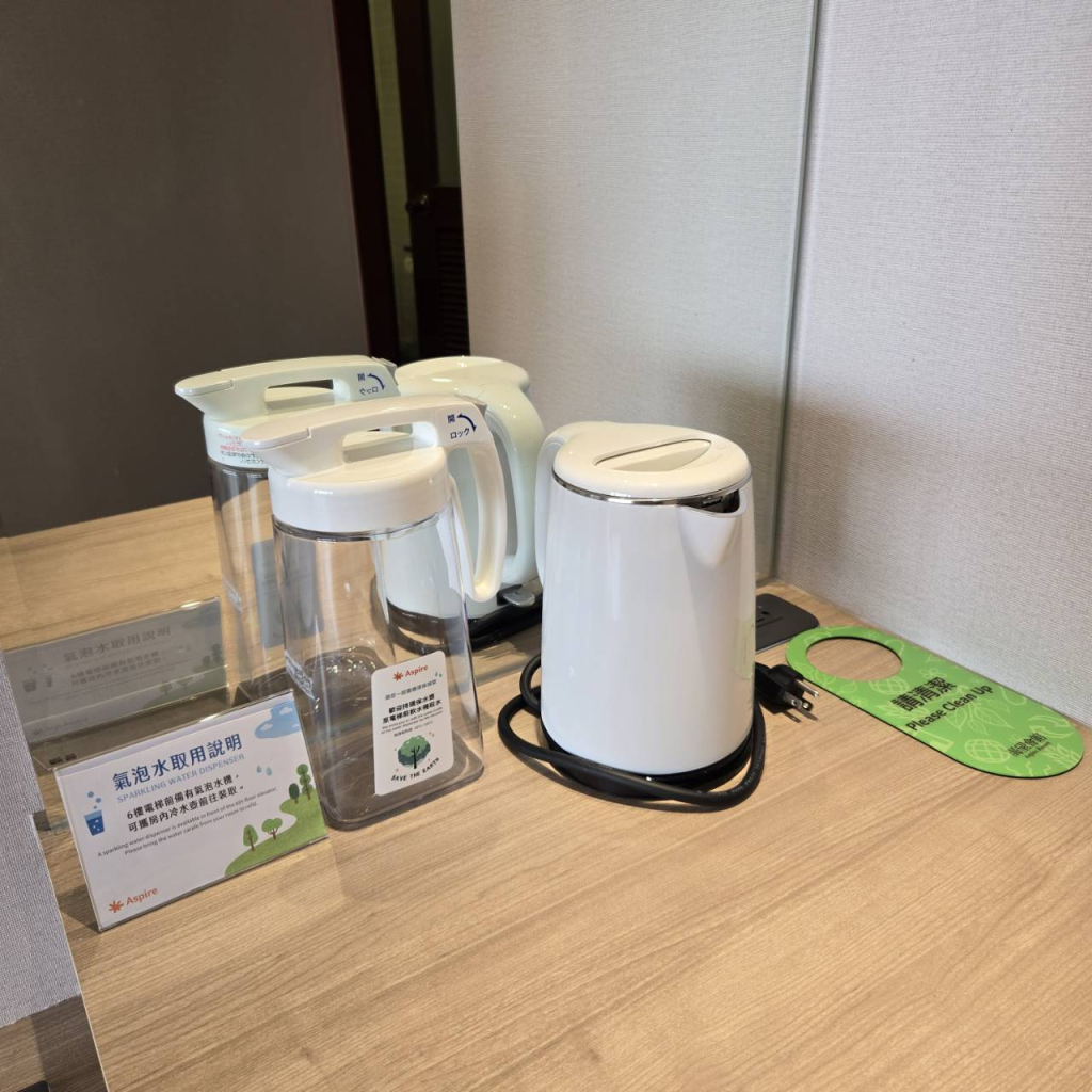 會館內有提供氣泡水機和飲水機,有需要的可以持房內的水瓶自行取用。