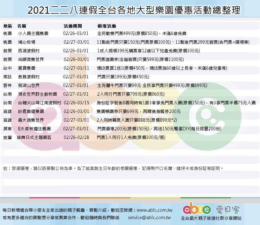 228連假要去哪裡呢?02/27-03/01全台各地的大地主題樂園都有優惠活動哦,快來看看!