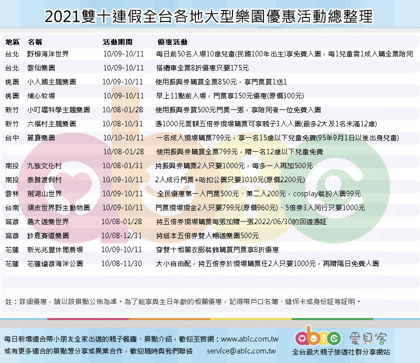 10/09-10/11全台各地的大地主題樂園都有優惠活動哦,票價折扣最多還有能免費入場哦,快來看看。