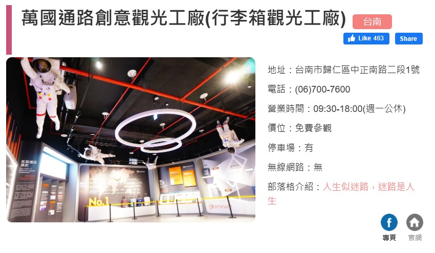 特色:台灣唯一行李箱觀光工廠-萬國通路創意觀光工廠以宇宙太空為主題,充滿科技感,透過影片、豐富的裝置佈景介紹萬國通路的品牌歷程。還有超好拍的行李箱拍照佈景、多媒體互動遊戲、DIY...