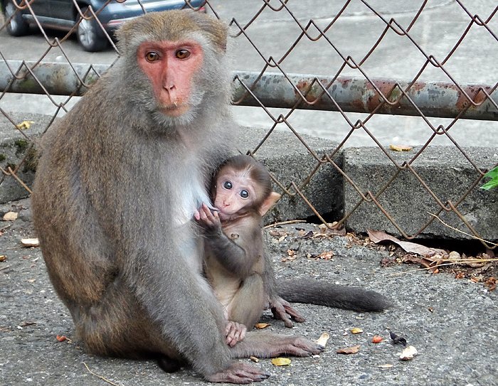 有時還能看到猴媽媽抱著猴寶寶前來討食,小寶寶窩在媽媽懷裡的模樣超萌的。