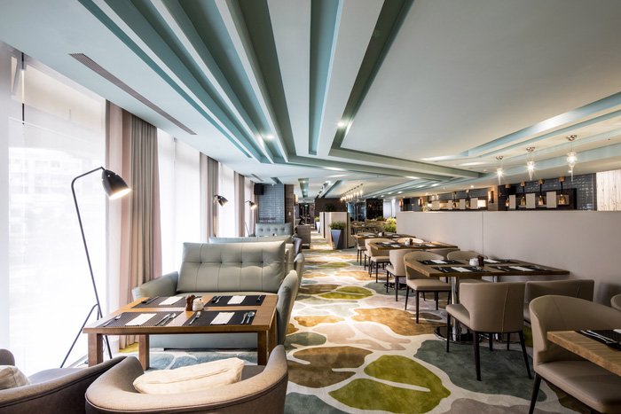 餐廳的設計柔和大方,配上跳躍的色彩讓人用餐時感覺非常舒服,而大片落地窗灑落出的池畔陽光,讓用餐的感覺更加美好。