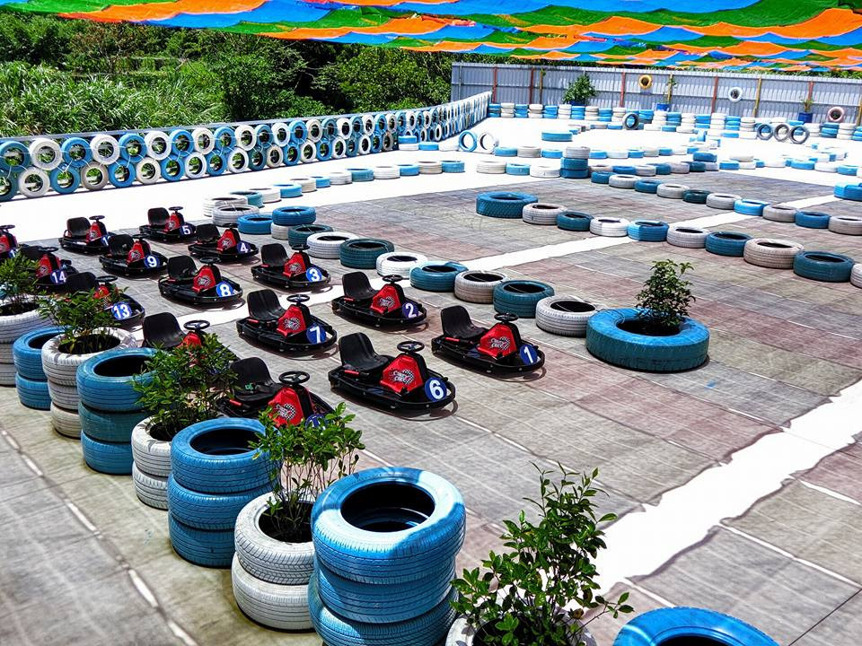 這裡的場地是戶外賽車場,寬敞的跑道、具挑戰性的彎道,讓大家盡享甩尾的樂趣,大部份的跑道上方有遮陽簾,不用擔心太曬。另外店家還設有沙坑、小戲水池、小小釣魚池、彈珠台等設施,讓小朋友在等候賽車時不無聊。
