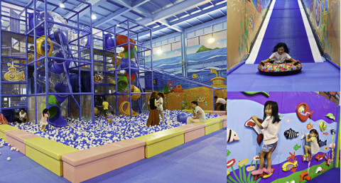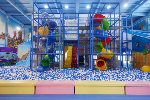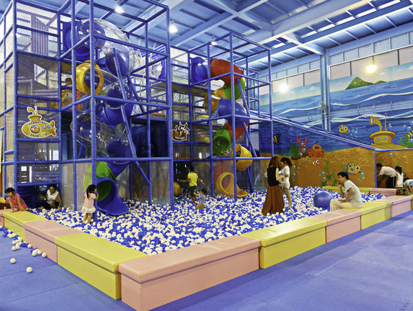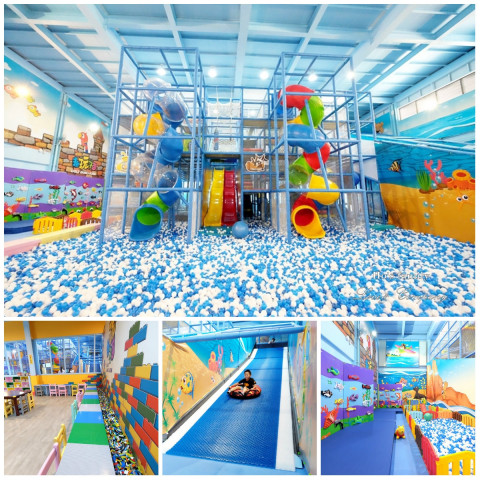 藍色系海洋造景的球池室很吸睛,球池上有2座近二層樓高的旋轉溜滑梯、2座波浪溜滑梯與一座速度很快的瀑布溜滑梯,滑梯內側有彈跳床、繩網等各式攀爬闖關設施,另一邊是海洋生物攀岩牆,還有類似滑草坡的設施,小朋友可以拉著滑草墊上去滑下來,牆邊也有一些幼教玩具讓小小孩玩。