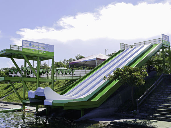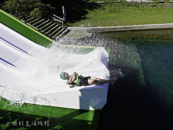 由5米高的水道快速滑下,再利用尾端坡度讓身體拋向空中落水,喜愛刺激的爸媽可以去挑戰看看,小朋友的話則有水上SUP、水上擂臺、充氣造型船等項目,也可單純戲水不玩設施。