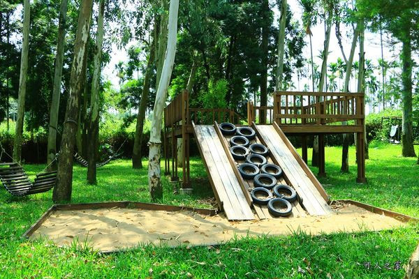 走入農場,筆直茂密的樹林、柔軟的草皮、木吊床,讓人放鬆,架高的木棧道可以帶著小朋友悠閒的漫步其中,享受森林浴,樹林裡有一座木製溜滑梯,滑梯下方是戲沙池,大人在一旁的吊床上休息,小朋友則有遊樂空間。