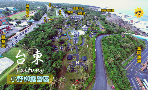 露營區在入口處右側,有棧板與頂棚營位,頂棚營位幾乎都擁有寬敞半獨立的空間,很適合獨露的家庭,營區每一帳配有桌椅與烤肉設施,設有門禁卡管制的浴廁乾淨舒適,這裡離富岡漁港很近,約3分鐘車程,有7-11與各式小吃海產店,覓食非常便利。