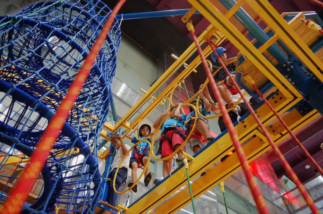 近二層樓高的探索樂園,以繩網構成的挑戰關卡,訓練小朋友的膽量、分析能力、鍛鍊體能,穿上護具,由教練引導往前,每過一個關卡好有成就感,下方有球池,另一側還有刺激好玩的旋轉溜滑梯。