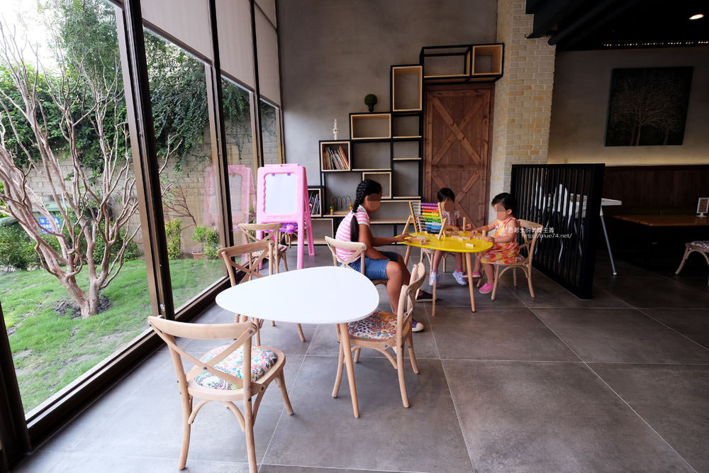 店家販售輕食、麵包、甜點與各式飲品,可在現場享用或是外帶回家,兒童遊戲空間不大,窗外一片綠意讓人心情開朗,提供繪本圖書、積木與各式益智玩具。