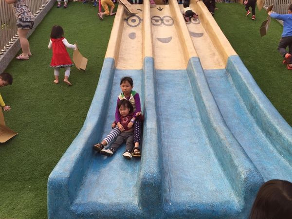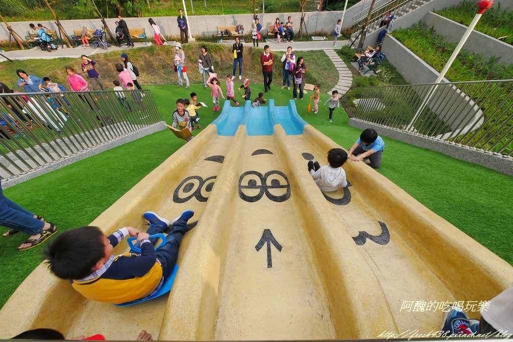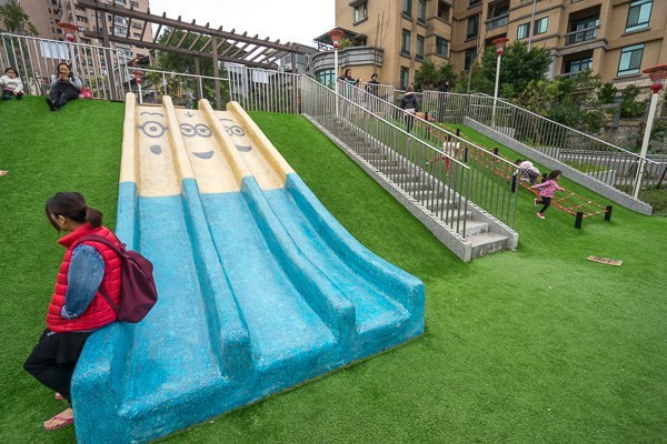 公園分為上下二層,上層有體健設施與搖搖馬,下層則是小朋友的遊樂天地,人工草皮鋪面,依山坡地勢而設計的磨石子溜滑梯有3個滑道,長270公尺,高度近2層樓高,還彩繪成小小兵的圖案,非常逗趣。