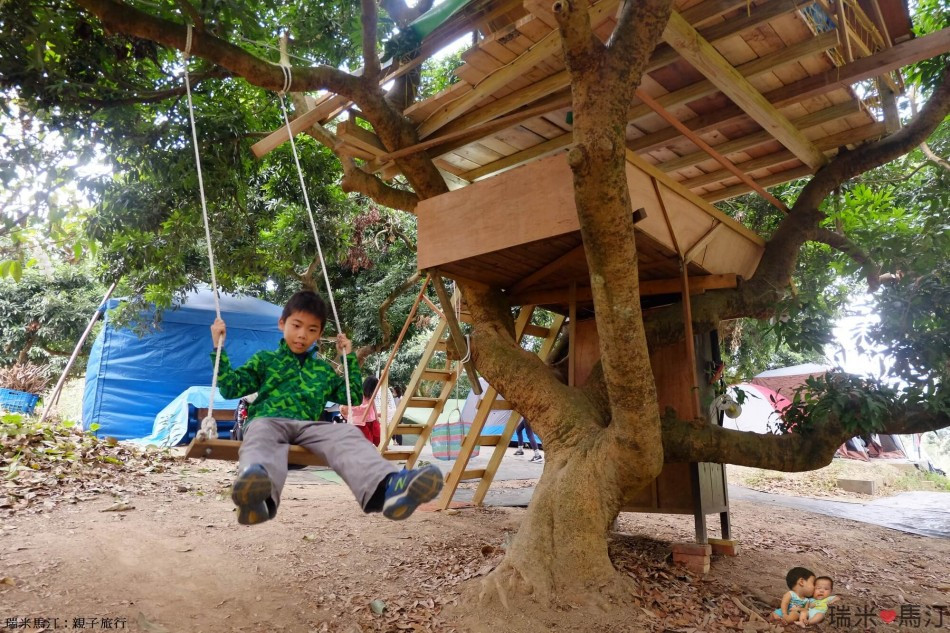 營區共可收約15帳,除了草地營位可容納5帳,其餘營位皆為單帳,每帳都有足夠的獨立空間,非常適合獨露家庭。營主除了搭設2座樹屋給小朋友玩,還有在營區裡的老樹綁上許多繩索,讓小朋友體驗爬樹的樂趣,對都市長大的小朋友來說是很難得的體驗。