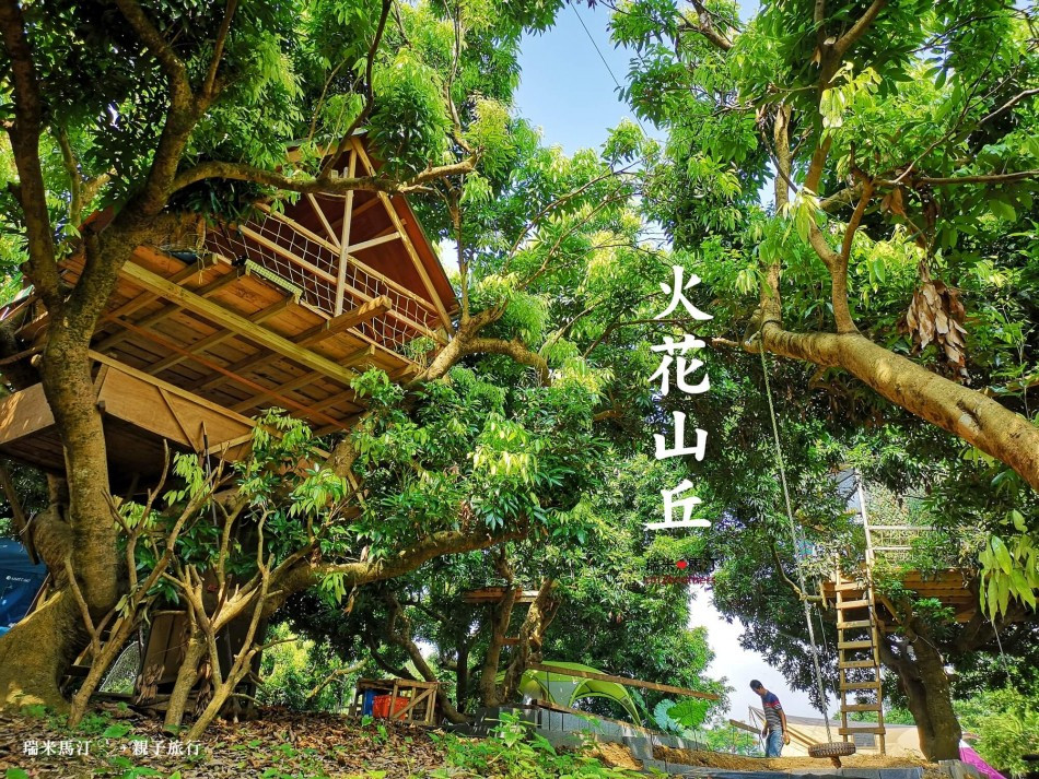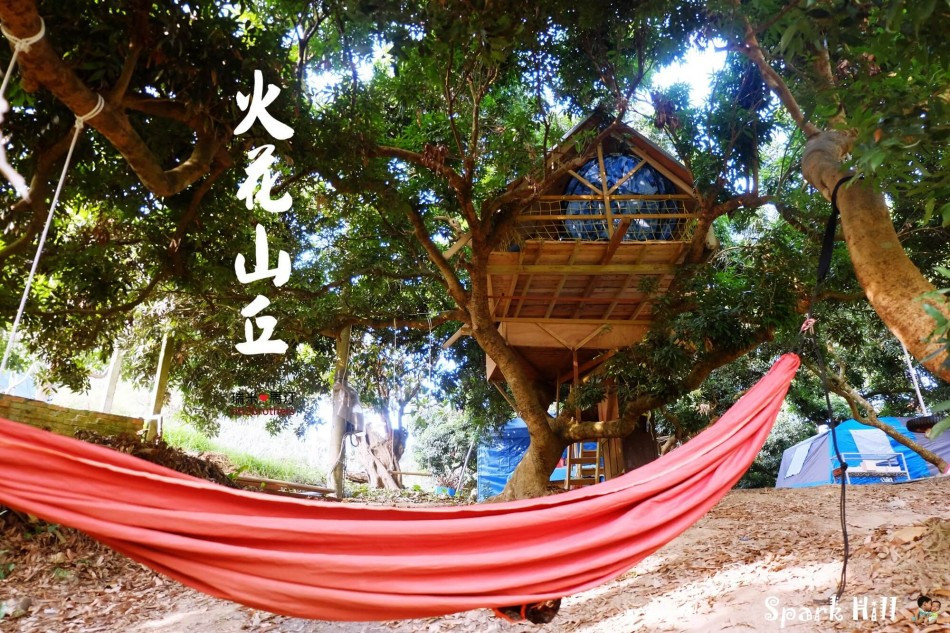 火花山丘露營區位在嘉義竹崎,2017年12月開始營運,以樹屋為主題的營區,裡面有多株近百年的老樹,設有二座小朋友的樹屋空間、多座盪鞦韆還有刺激好玩的滑索設施。