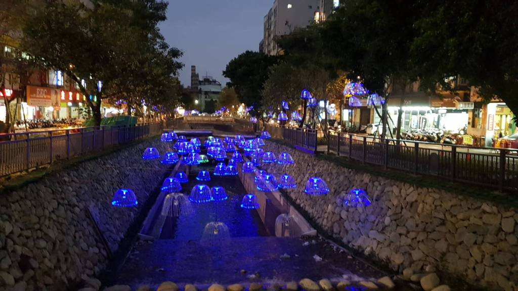 優雅的S型河道、穿越綠川的鍵盤階,一旁閃爍著浪漫的蒲公英花燈,另一側的河川上則飄著可愛的水母燈,橋的下方擺盪著漂亮的花束,重新整治後的綠川變的更美麗了。