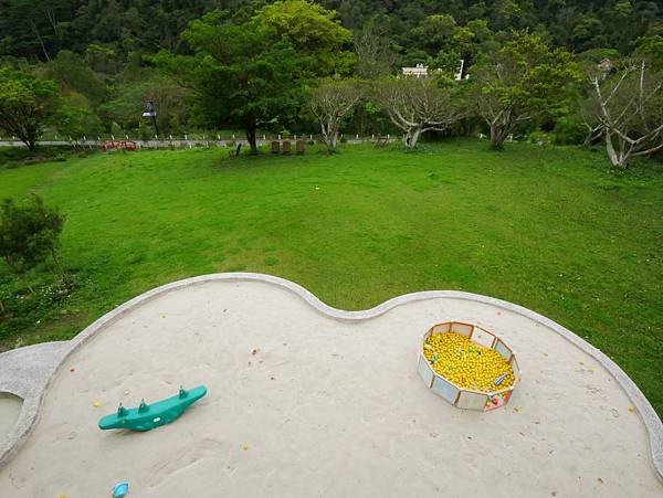 白色細沙坑是小朋友的最愛,沙坑上有蹺蹺板、彩色小球池等玩具,大片的草皮好適合小朋友跑跳,記得帶上球類或泡泡水玩具來,可以玩的更盡興。