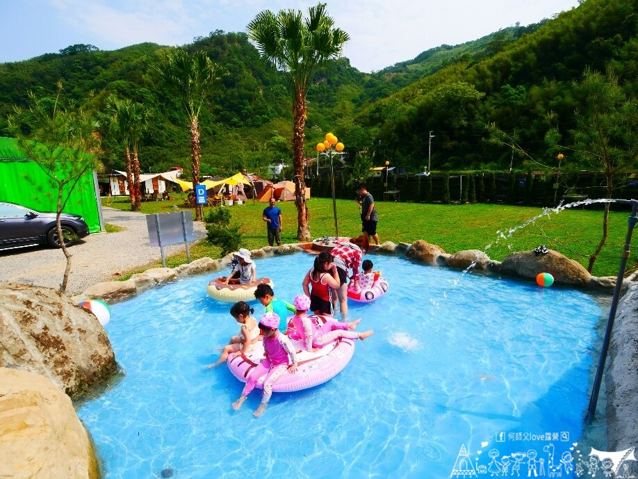 多樣的遊樂設施讓小朋友玩不停,有攀岩牆溜滑梯、滑草、戲水池、彈跳床、投籃機與沙坑,貼心的營主用細網圍繞沙坑,玩沙不用怕蚊蟲叮。另外還有九宮格、羽毛球組等玩具給小朋友玩,營區旁即是溪水,夏天就是要盡情戲水。