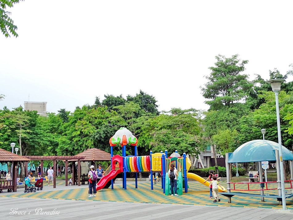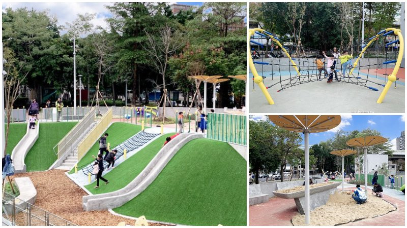 新遊戲場結合斜坡設計,有2座磨石子溜滑梯、人工草皮滑草區、繩網攀爬、搖搖馬、沙坑、沙桌、立體攀爬網、鳥巢鞦韆等,滑梯下以木屑鋪面做緩衝,更貼近大自然。另外公園內也有公廁與清洗區,帶小朋友來很方便。