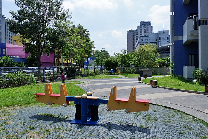 校園空間不算大,但規劃不少給小朋友玩的設施,大門旁有蹺蹺板與搖搖馬。