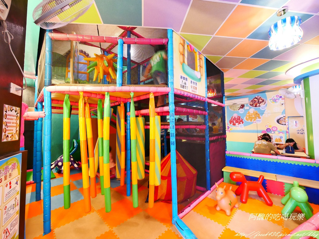 餐廳裝潢明亮活潑,擺飾五彩繽紛,充滿童趣,遊戲區限2-6歲,入內需脫鞋著襪,遊戲區內有一座不小的溜滑梯攀爬闖關組,在裡爬上爬下、東跑西躲、左盪右滑,宛如迷宮般的玩樂天堂,吸引著小朋友,外面還有有跳跳馬與塑製動物座椅。