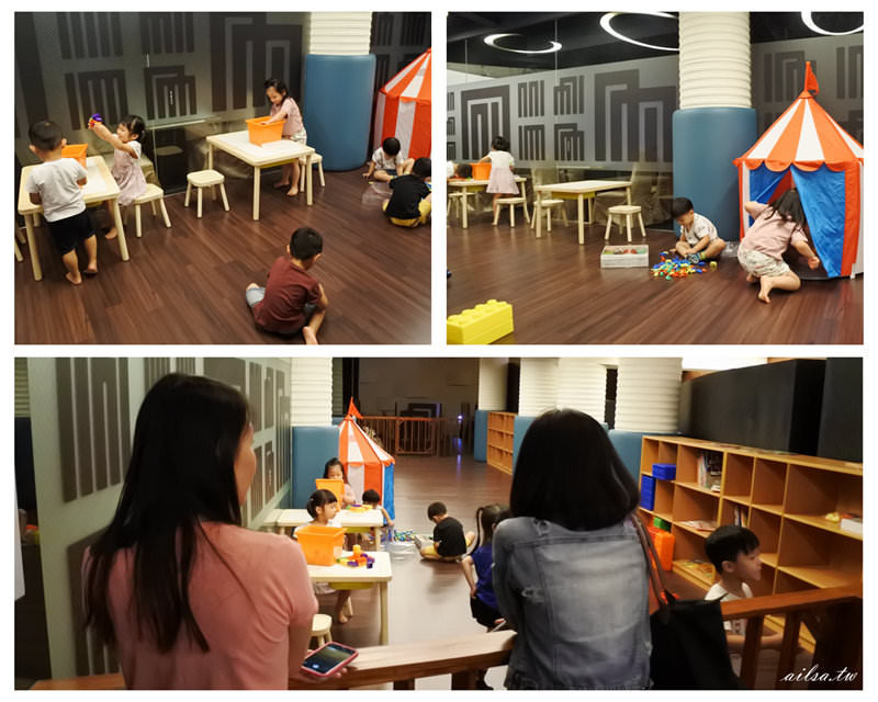 兒童遊戲區為半獨立的空間,不會直接影響到其他用餐者,使用木地板鋪面,為長條狀的空間,有小帳篷,大型軟積木、繪本圖書等玩具,未來還會再增加球池與一些設施,當小朋友吃飯坐不住時,就來遊戲區玩一下。