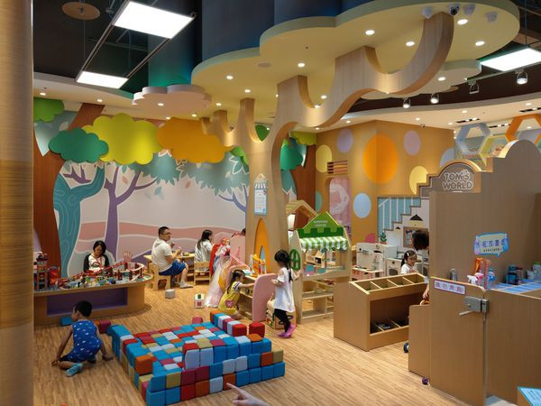 文心店以幻想書屋為主題,彩色森林、夢幻的色彩布置。裡面分為多個遊戲區域,這裡是廚房超市扮家家酒區。