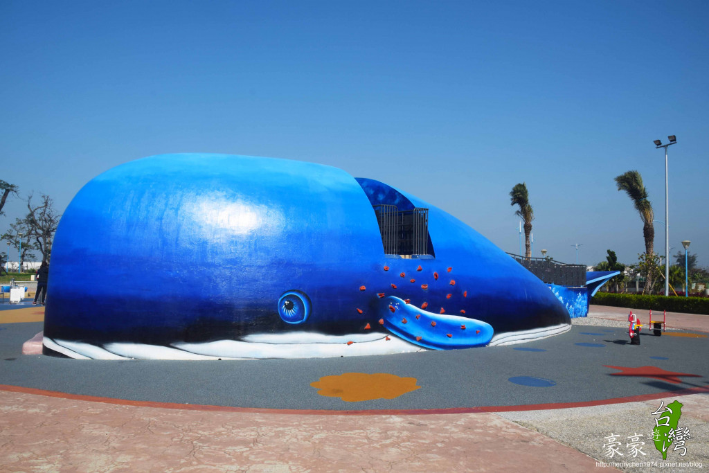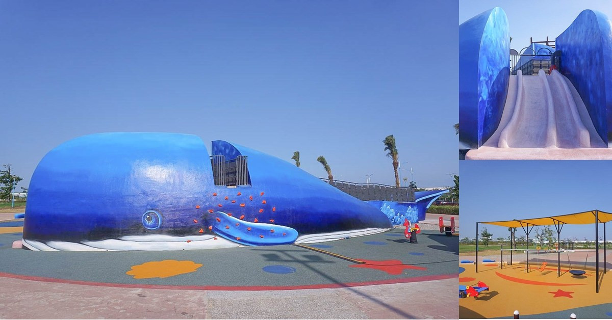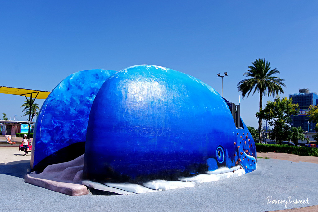 大大的鯨魚溜滑梯吸引大小朋友的注意,不只好看也好玩,鯨魚身上有攀岩牆、無障礙步道,大嘴巴就是好玩的溜滑梯。