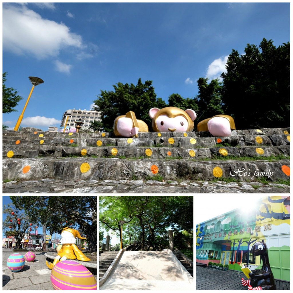 充滿童趣的裝置藝術可愛又好拍,下次來逛夜市時可以早點來,先帶小朋友走走公園拍照趣,且公園內還有寬/窄二滑道的磨石子溜滑梯可以玩。