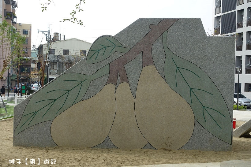 公園佔地約500多坪,有步道、草皮、香氛花園等,兒童遊戲場是一座大沙坑鋪面,沙坑上有枇杷圖像的磨石子溜滑梯、包覆式與一般鞦韆、獨木橋、跳樁與沙桌。