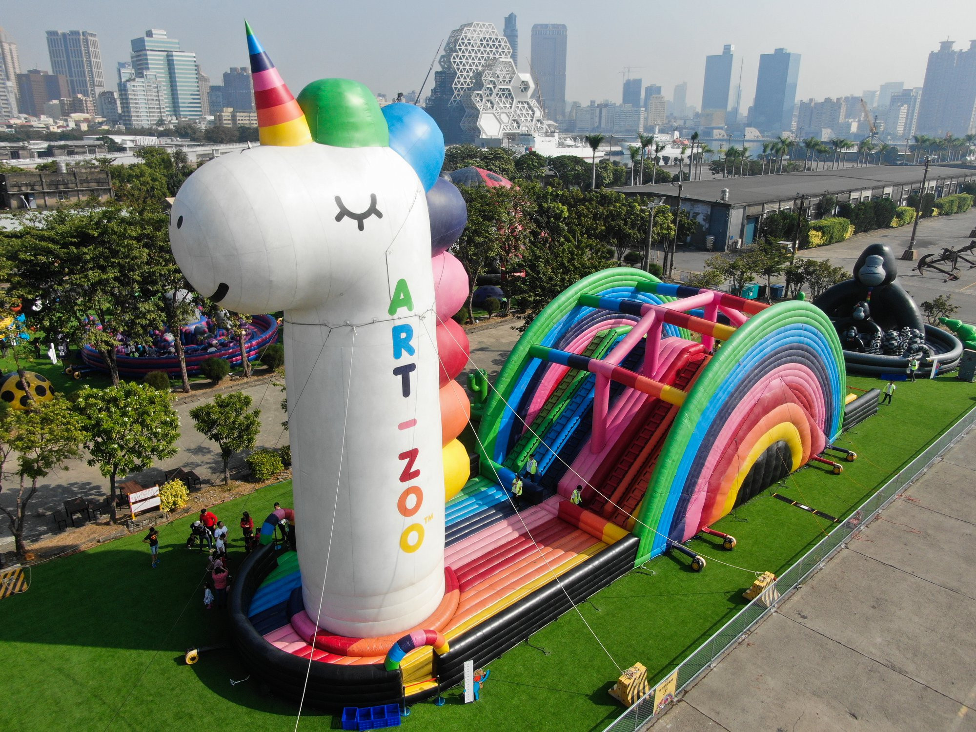 全世界最大動物主題氣墊樂園-ArtZoo藝術動物園,12/16再度於高雄展出!今年移師高雄港七號碼頭(棧柒庫),並升級氣墊造型,有好拍好玩的彈跳氣墊,還有刺激歡樂的獨角獸溜滑梯氣墊。