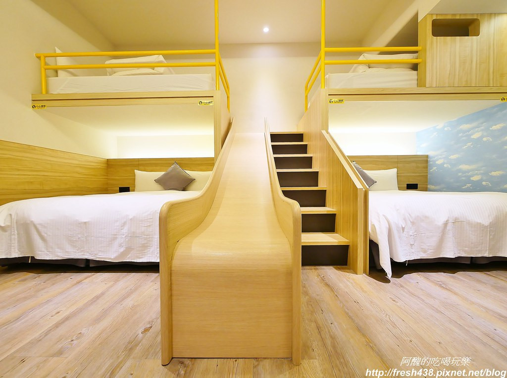 溜滑梯房型可供4-6人入住,帶長輩出遊一起入住都沒問題。溜滑梯以原木手工打造,小朋友在這裡就可以玩上一陣子,且房內還有泡澡浴缸可以讓小朋友泡澡玩水。