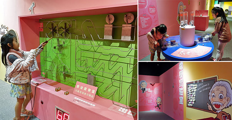 館內分為「電學、光學、力學、生理醫學」四大基礎科學,展示超過20個互動遊戲,有人體發電、光的魔法、電流急急棒、飛球競速、聲波形狀等,好像在看魔術一樣,非常有趣,而現場將牛頓、愛迪生等知名科學家畫成卡通人物,增加展區活潑氣氛。