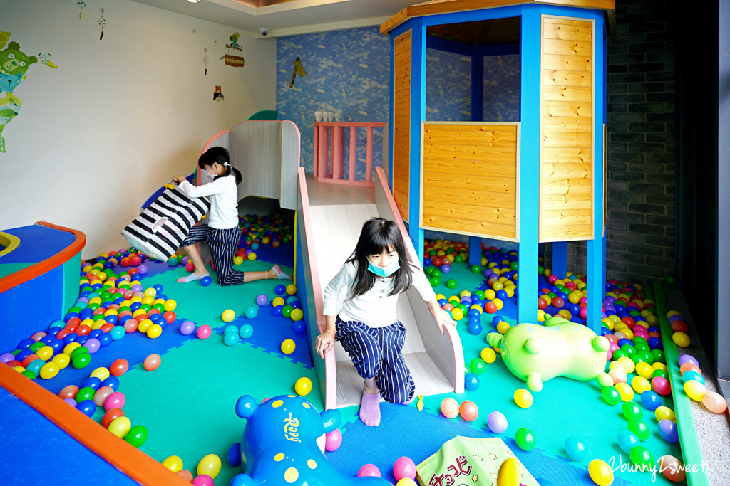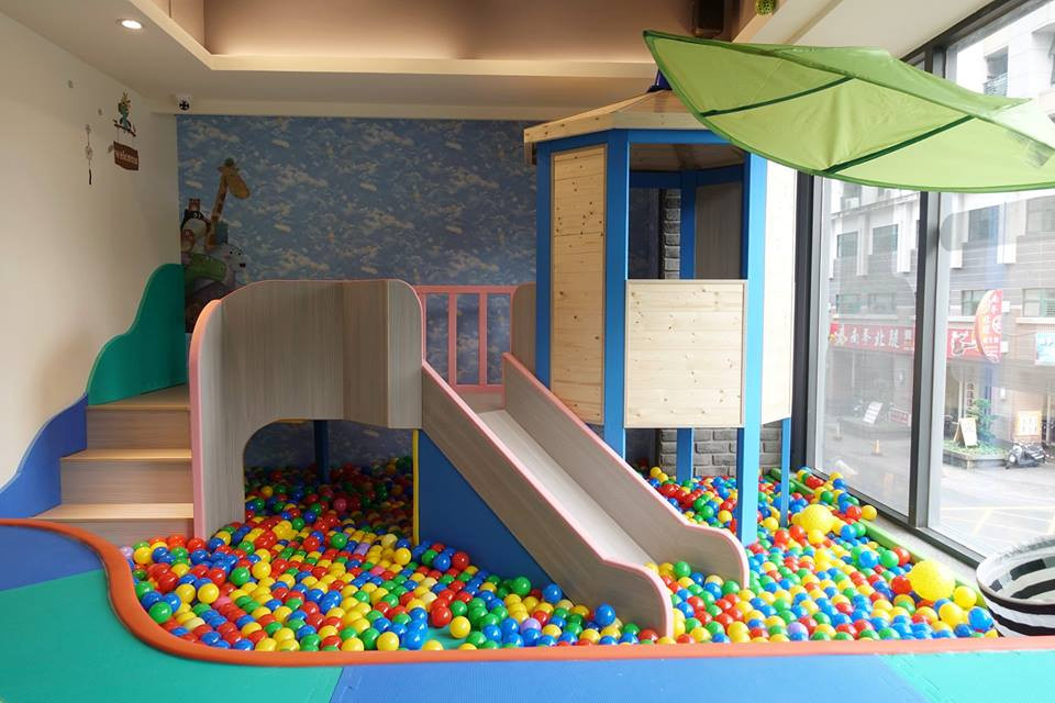 二層樓的空間設計寬敞明亮,以大地色系打造讓人放鬆的環境。兒童遊戲室位在二樓,有木屋溜滑梯、球池、跳跳馬等玩具,另有一台電視隨時播放卡通給小朋友看,遊戲室旁有一間包廂,若爸媽預約此包廂,可在按摩時隨時看到小朋友的狀態。