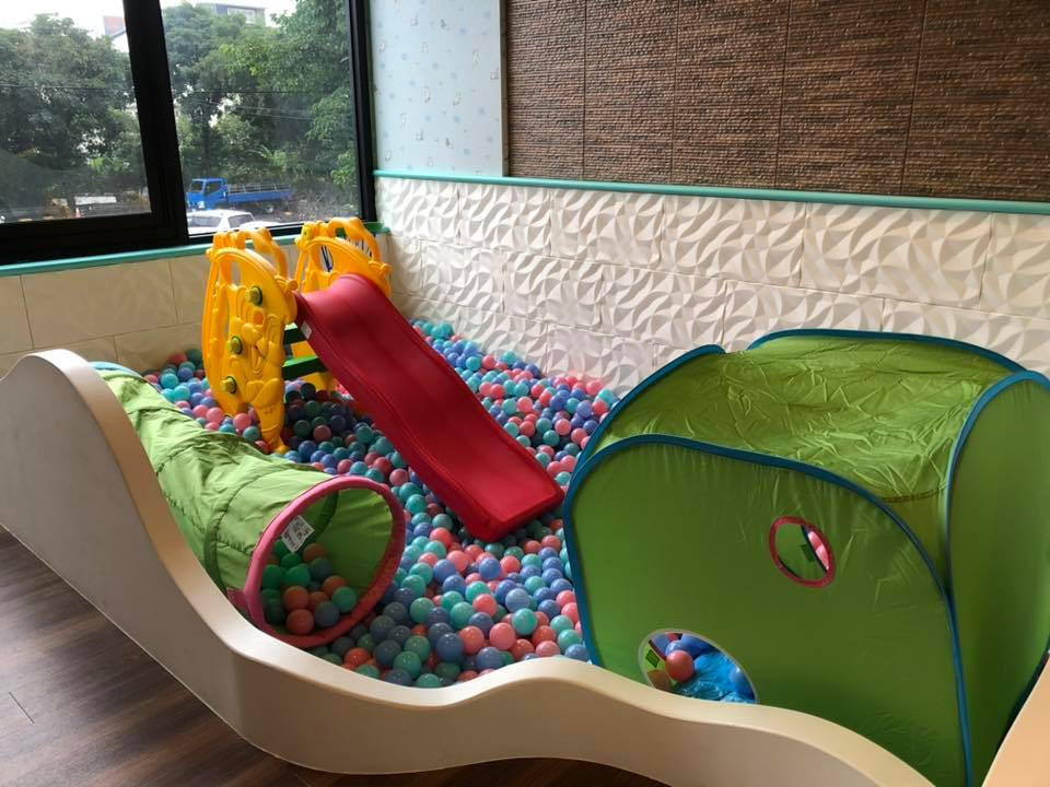 餐廳共有2層樓,一樓純用餐區,輕工業風很適合聊天喝咖啡。二樓為用餐+兒童遊戲區,設計上則走童趣風格,遊戲區無限定小朋友年齡,半獨立空間有幼兒溜滑梯、球池、益智玩具與繪本圖書。