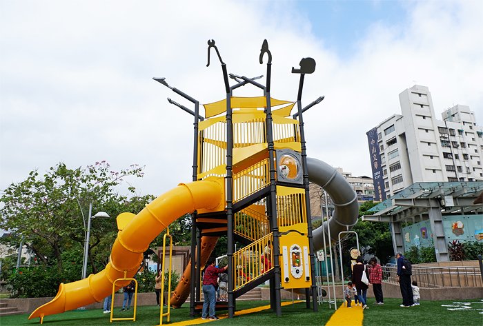 公園內最吸睛的就屬二層樓高溜滑梯,滑梯分為高、中、低三個滑道,滿足各年齡層小朋友。