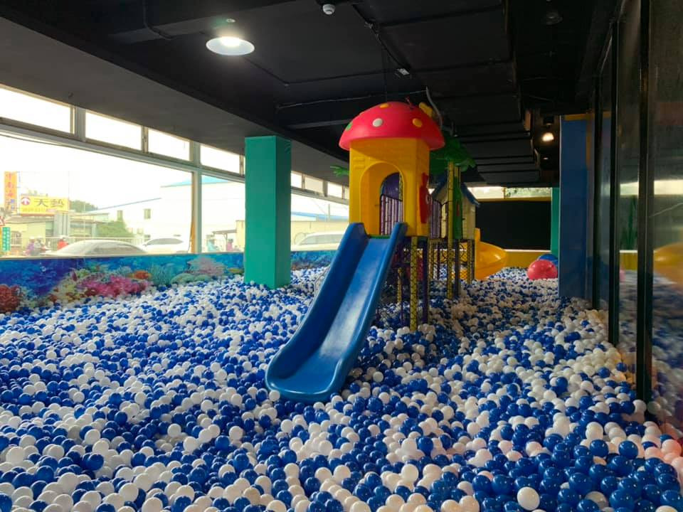 兒童遊戲區是60坪的大型球池海,裡面有一座溜滑梯遊戲組與大球,近10萬顆藍白球池讓小朋友開心的在裡面遊遊玩翻滾。