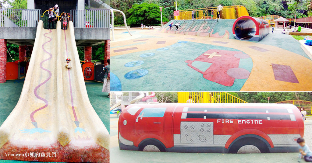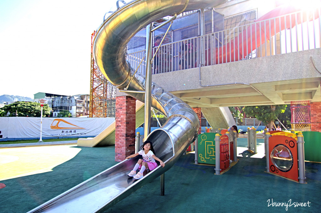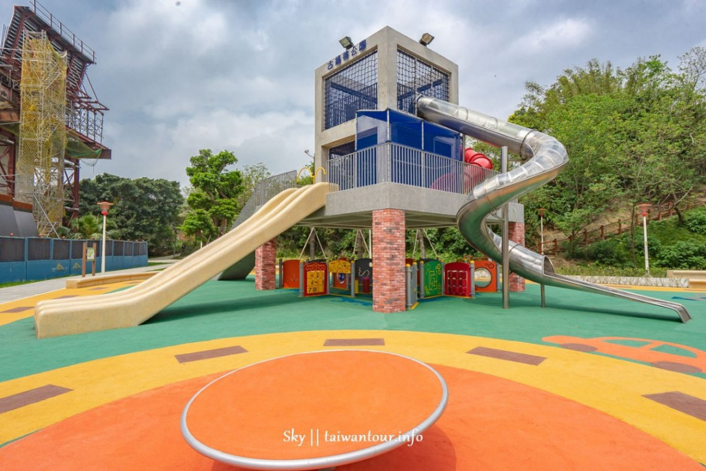 遊戲場最吸睛的就屬超過2層樓高的古鐘樓意象溜滑梯,由古鐘樓延伸而出有磨石子、金屬旋轉與水管三座滑梯,一旁有攀爬設施,鐘樓下方還有幼兒遊戲區。