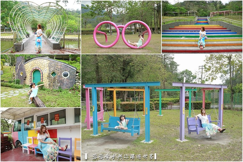 大草皮上出現一個巨大粉色眼鏡,另一側有彩色鞦韆搖椅、彩色巴士、彩虹階梯等好拍照的場景,最吸引大家的就是3間哈比人小屋,矮小的屋子有原民、童話與叢林風,拍起來很特別。