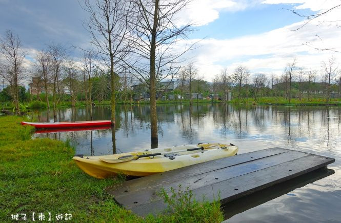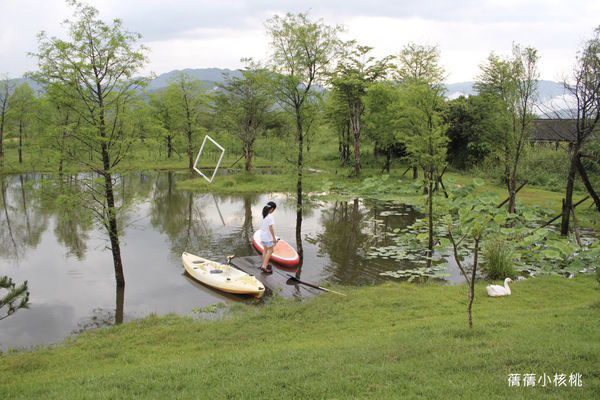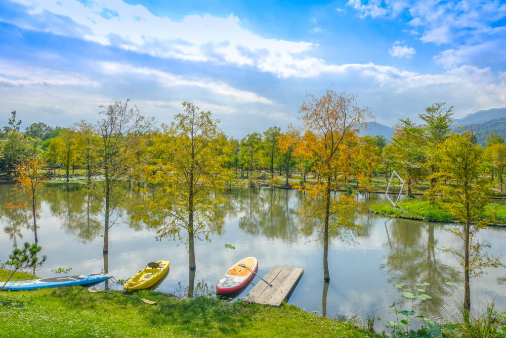 宜蘭十六崁民宿擁有寬廣的庭園空間,大片草地與人工湖泊,種植300多顆落羽松,景色優美,湖上擺放獨木舟,全家人還可划著獨木舟在湖上享受悠閒風情。