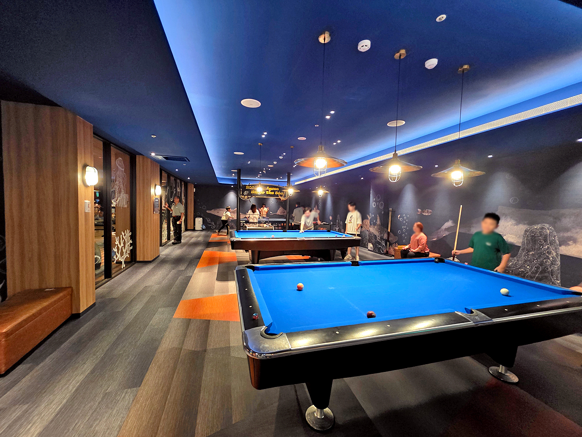 瑞奇活力館另設有桌撞球遊憩空間,使用暗藍色調加上海洋生物圖案,好像走入海底世界。